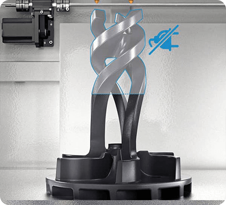 Intelligent dual-extruder system with a mechanical shut-off for the inactive nozzle. Prevents material leakage, cross-contamination, and stringing — essential for precise multi-material and support-structure printing. Fast nozzle changes, heating up to 400 °C in approximately 2 minutes, and temperature stability of ±0.15 °C. Ideal for ABS, PC, Nylon, PA-CF, and high-performance composites.