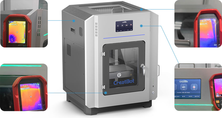The fully enclosed 200 °C chamber provides 360° hot-air circulation, prevents internal stress and enables warp-free parts. Perfect for printing and direct annealing of PEEK and PEI components.