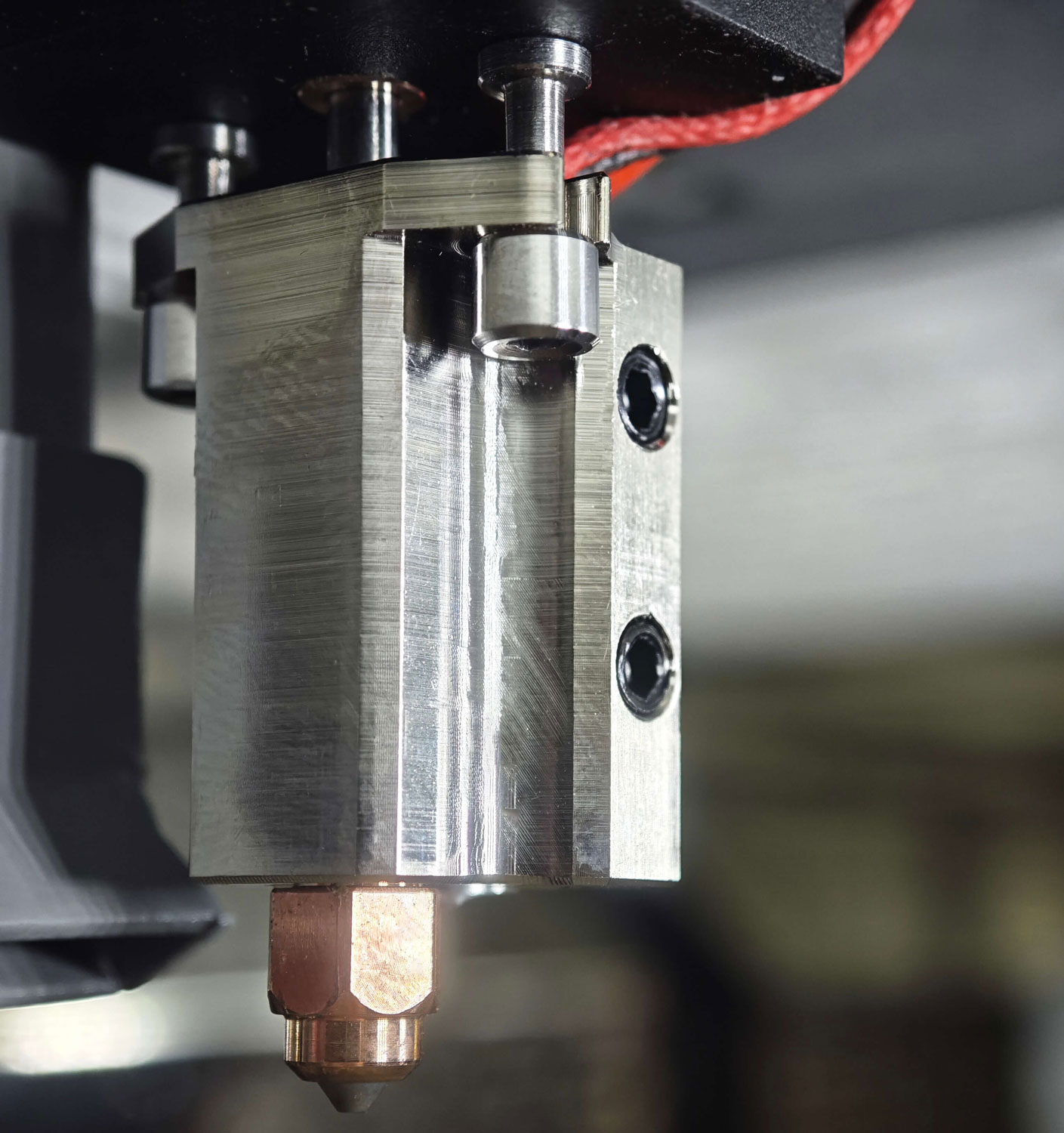 The dual-tooth silicon carbide extruder is designed for extreme continuous temperatures, water-cooled, and can be replaced within 30 seconds. It ensures maximum process stability when printing PEEK, PEI, UltraPA-CF, or other high-performance materials.